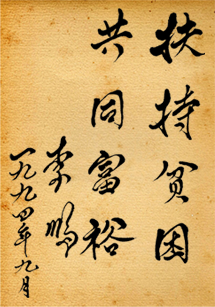 1994年9月 時任中共中央政治局常委、國務(wù)院總理李鵬為評選"全國十大扶貧狀元"活動題詞:扶持貧困 共同富裕