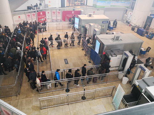 在北京某高鐵站一進(jìn)站口,春運(yùn)前夕的候車乘客擠滿了隔離欄列成的“九曲十八彎”,等待安檢長隊(duì)中的旅客熙熙攘攘。而旁邊封閉的安檢通道上,兩臺安檢設(shè)備閑置。人流隊(duì)伍日漸擁擠,有旅客因?yàn)榈却患?,急于進(jìn)站,與安檢人員發(fā)生爭執(zhí)。