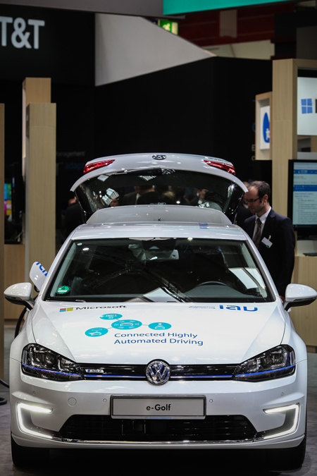 在德國(guó)漢諾威舉行的工業(yè)博覽會(huì)上,與會(huì)者參觀自動(dòng)駕駛汽車 張帆攝