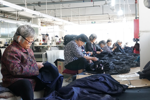 河南沈丘縣永盛服飾有限公司車間內(nèi),在家閑不住的老人們到車間打零工,掙點零花錢 王林園 攝