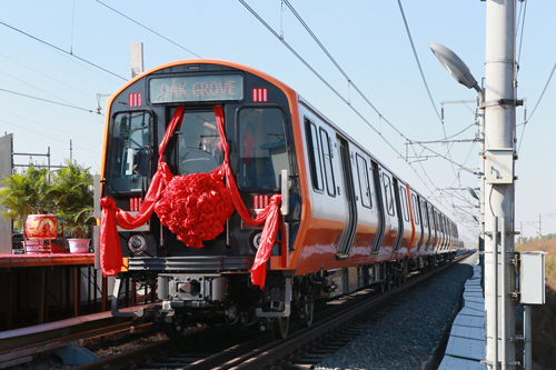 中車長春軌道客車股份有限公司研制的首批美國波士頓橙線地鐵車在長春下線,成為首次登陸美國市場的國產(chǎn)軌道交通裝備(2017年10月16日攝)。段續(xù)攝