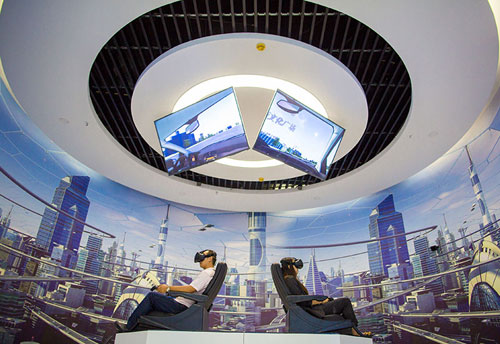市民在內(nèi)蒙古呼和浩特玉泉區(qū)大數(shù)據(jù)應(yīng)用產(chǎn)業(yè)基地體驗(yàn)VR眼鏡(2017年8月1日攝)。新華社發(fā)(丁根厚 攝)