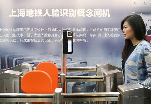 在上海申通地鐵集團(tuán)有限公司,工作人員在現(xiàn)場(chǎng)體驗(yàn)刷臉進(jìn)站技術(shù)(2017年12月5日攝)。新華社記者 丁汀 攝
