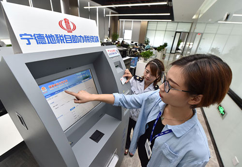 寧德時(shí)代新能源科技有限公司的員工在辦稅員的指導(dǎo)下試用自助辦稅終端(2017年10月12日攝)。新華社記者 宋為偉 攝