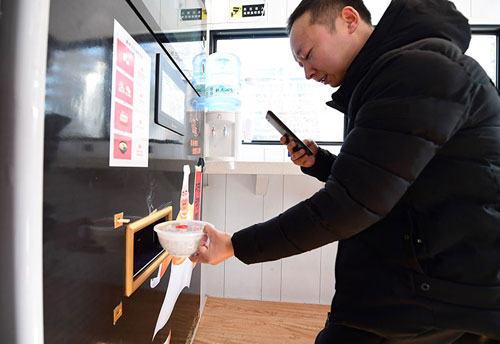 在位于西安曲江創(chuàng)客大街邊的一家無人面館內(nèi),市民用手機(jī)拍攝機(jī)器剛做好的面食(1月10日攝)。新華社記者 邵瑞 攝