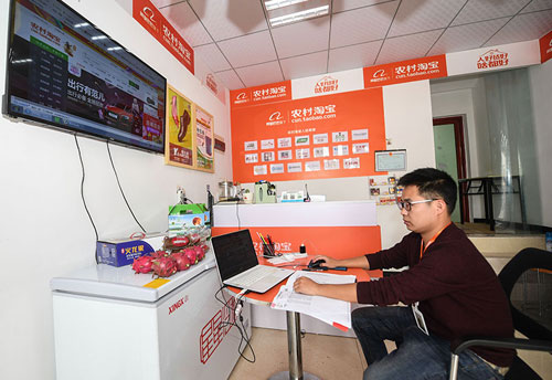 浙江省長興縣南太湖陳家浜村的農(nóng)村淘寶店主陳世昌在網(wǎng)店上推廣當(dāng)?shù)剞r(nóng)產(chǎn)品(2017年11月10日攝)。新華社記者 徐昱 攝