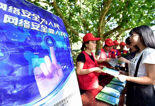 河北省廊坊市安次區(qū)網(wǎng)信辦工作人員和志愿者向?qū)W生們發(fā)放網(wǎng)絡(luò)安全宣傳折頁,倡導(dǎo)廣大師生提高網(wǎng)絡(luò)安全意識(shí),共同維護(hù)網(wǎng)絡(luò)社會(huì)秩序(2017年9月19日攝)。新華社記者 王曉 攝
