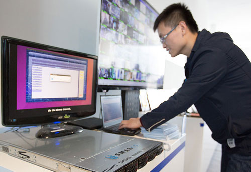在北京智能計(jì)算產(chǎn)業(yè)研究院舉行的發(fā)布會(huì)上,工作人員在現(xiàn)場(chǎng)演示高通量人工智能一體機(jī)的實(shí)際應(yīng)用(2017年12月6日攝)。新華社記者 金立旺 攝