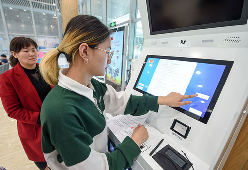 在南京市棲霞區(qū)商事登記服務(wù)大廳,市民用自動(dòng)終端機(jī)辦理業(yè)務(wù)(3月29日攝)。新華社記者 李博 攝