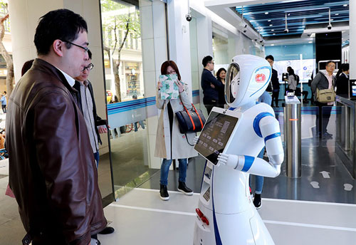 一位市民在位于上海九江路的無人銀行入口處向迎賓機(jī)器人說明需要辦理的業(yè)務(wù)種類(4月12日攝)。近日,中國建設(shè)銀行在上海九江路開出國內(nèi)首家無人銀行。新華社記者 方喆 攝