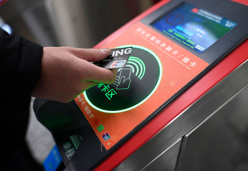 乘客在杭州地鐵豐潭路站體驗(yàn)使用帶有閃付功能的銀聯(lián)IC卡過閘乘車(2017年12月27日攝)。新華社記者 黃宗治 攝