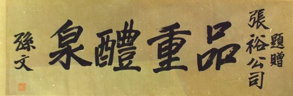 人教版全日制普通高中教科書《中國近代現(xiàn)代史》上冊第二章第三節(jié),刊有孫中山先生在1912年8月21日題贈張裕公司的“品重醴泉”橫幅原件攝影,圖片注解為“華僑實業(yè)家張弼士在煙臺獨資創(chuàng)辦張裕葡萄酒公司。孫中山曾為這家民族企業(yè)題詞”。