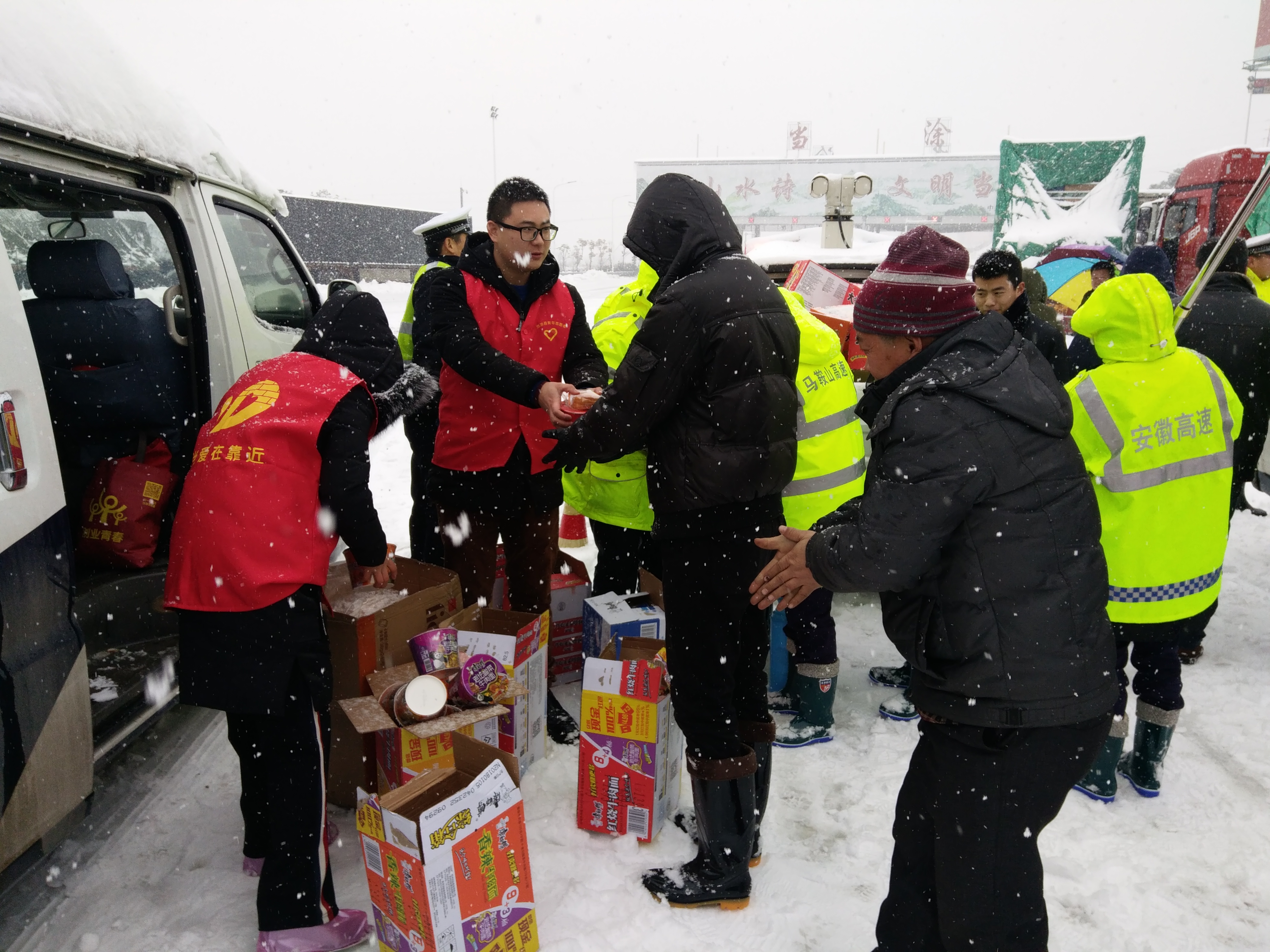郭武林的故事只是一個(gè)縮影。由于連降暴雪,全市道路最大積雪深度達(dá)到28厘米,由于道路封閉,滯留在馬鞍山市各高速公路出入口的車輛超過1000臺(tái)。就在2000余名司乘人員面對饑寒交迫的困境時(shí),馬鞍山市志愿者們出現(xiàn)在了風(fēng)雪中,為滯留人員送來了熱水和食物,還有一張張溫馨提示的宣傳單。