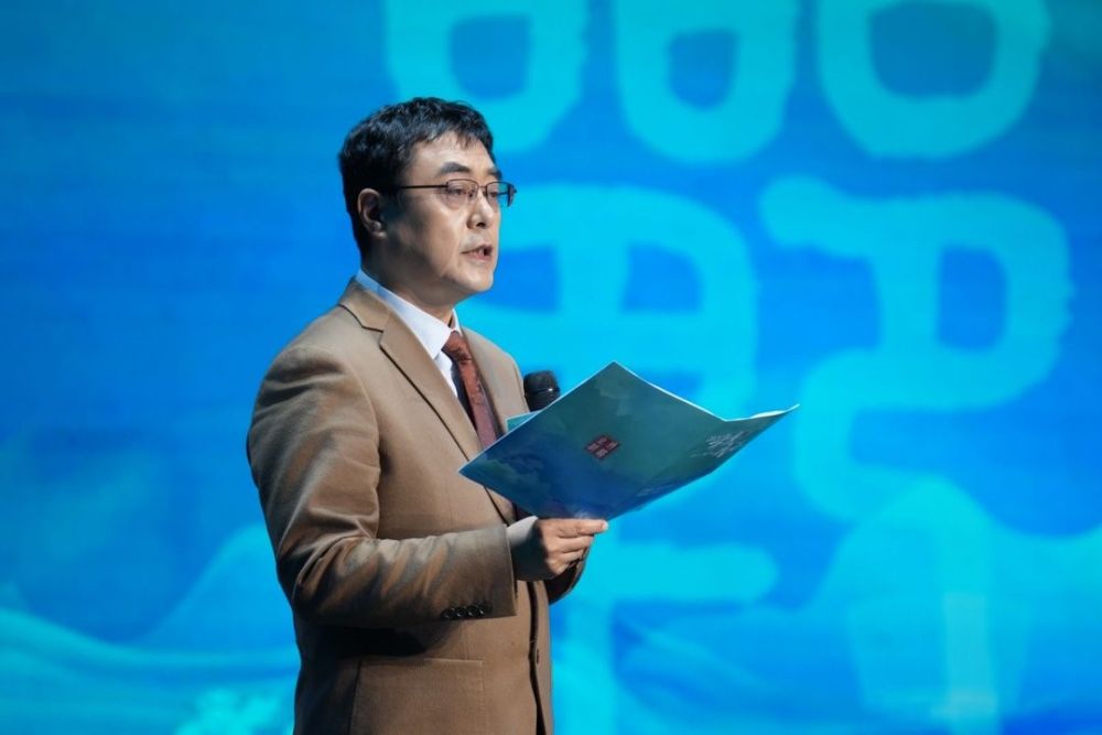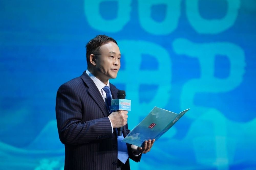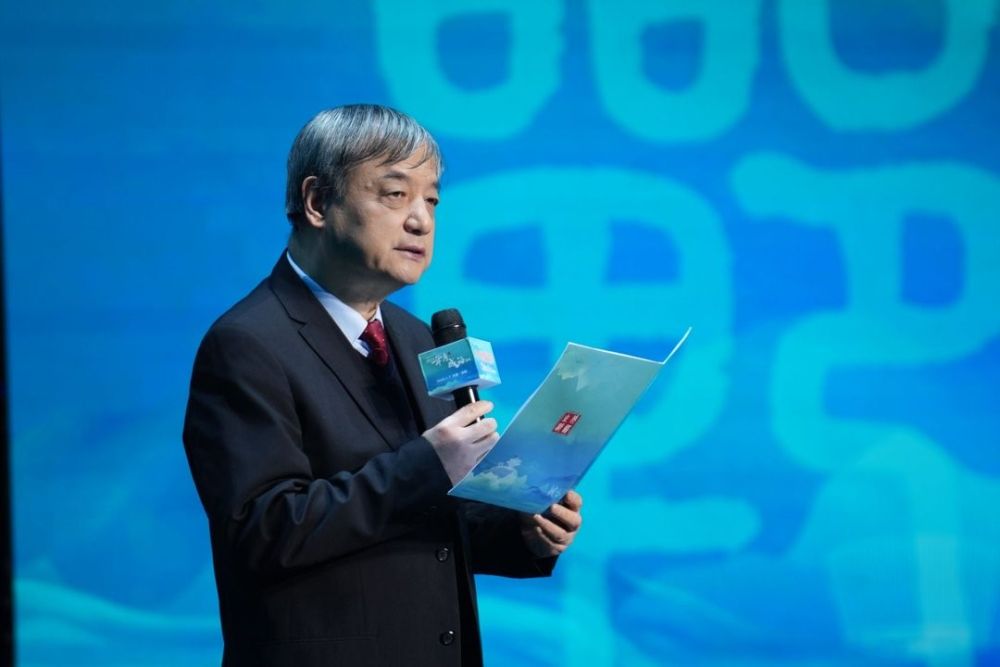 圖為中國傳媒大學(xué)教授、博導(dǎo),國家語言資源監(jiān)測與研究有聲媒體中心主任鄒煜發(fā)布“2025年度成語”之“海納百川”