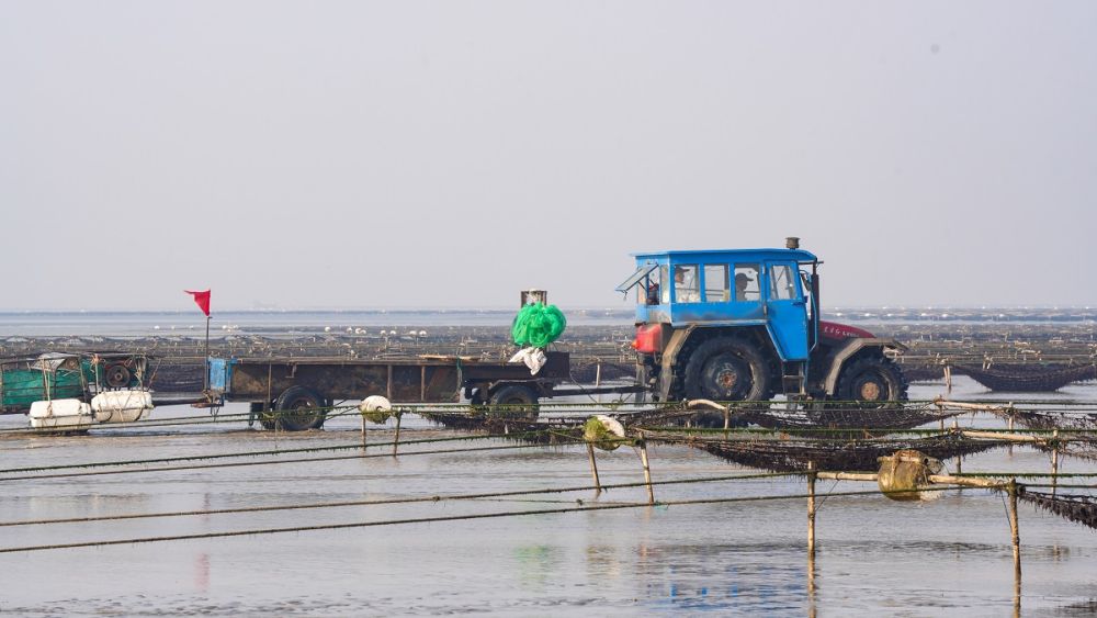 半個小時后,拖拉機(jī)停了下來。此時,先發(fā)隊(duì)伍中的濱海村村民老曹一家已經(jīng)一頭扎進(jìn)了數(shù)不盡的竹排中,熟練地忙碌了起來。“如今機(jī)械收菜比過去輕松多了,兩個人、一臺拖拉機(jī)、一臺采摘機(jī),就能完成過去五個人的工作量?!崩喜苋苄旅?,養(yǎng)殖條斑紫菜已有三十多個年頭,見證了從純?nèi)斯な崭畹桨霗C(jī)械化作業(yè)的轉(zhuǎn)變。